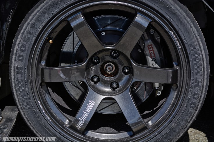 Volk Racing TE37 SAGA, StopTech Trophy big brake kit and Hoosier A7 R-Comps keeps the 800 horses planted on the pavement.