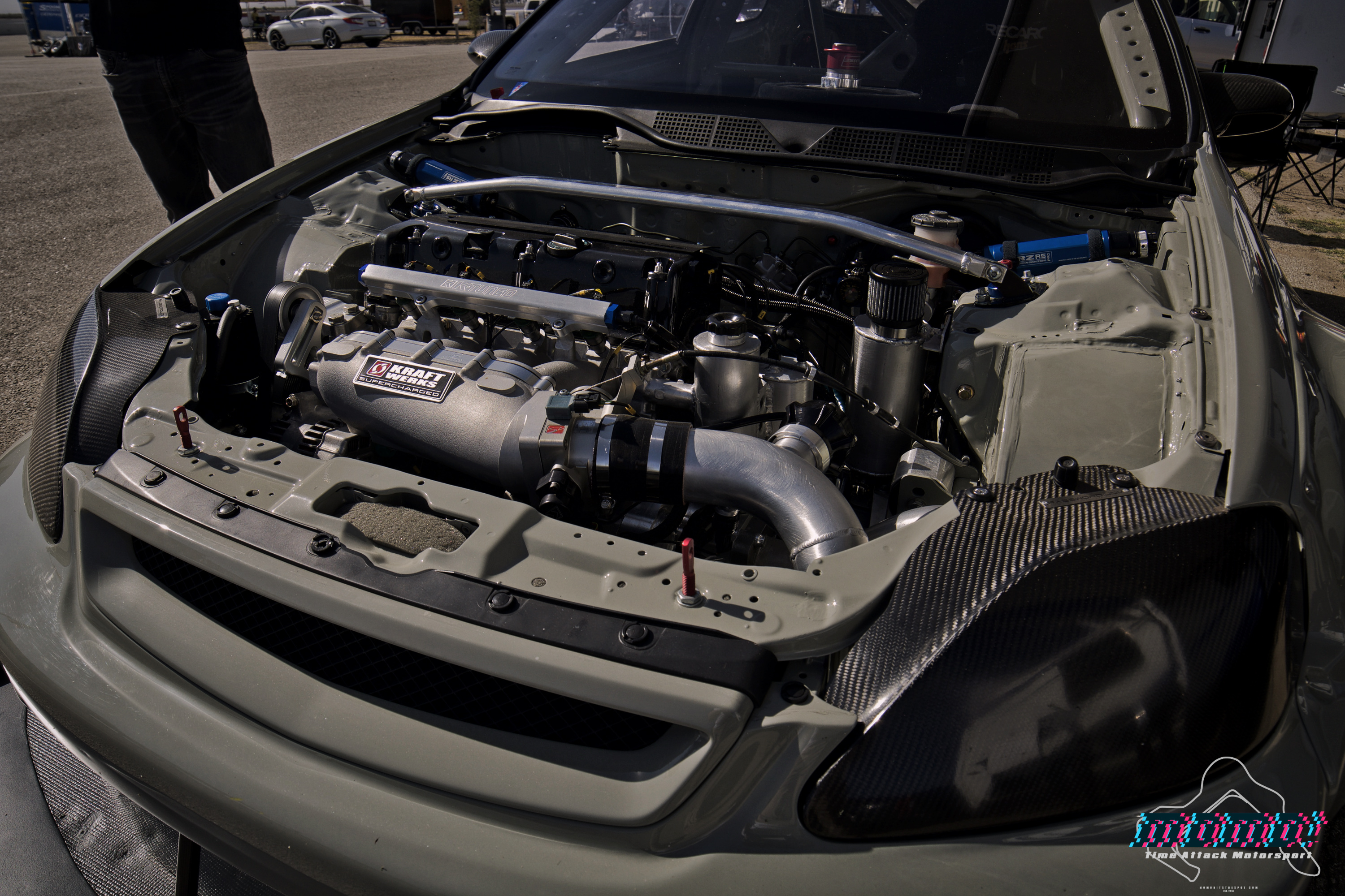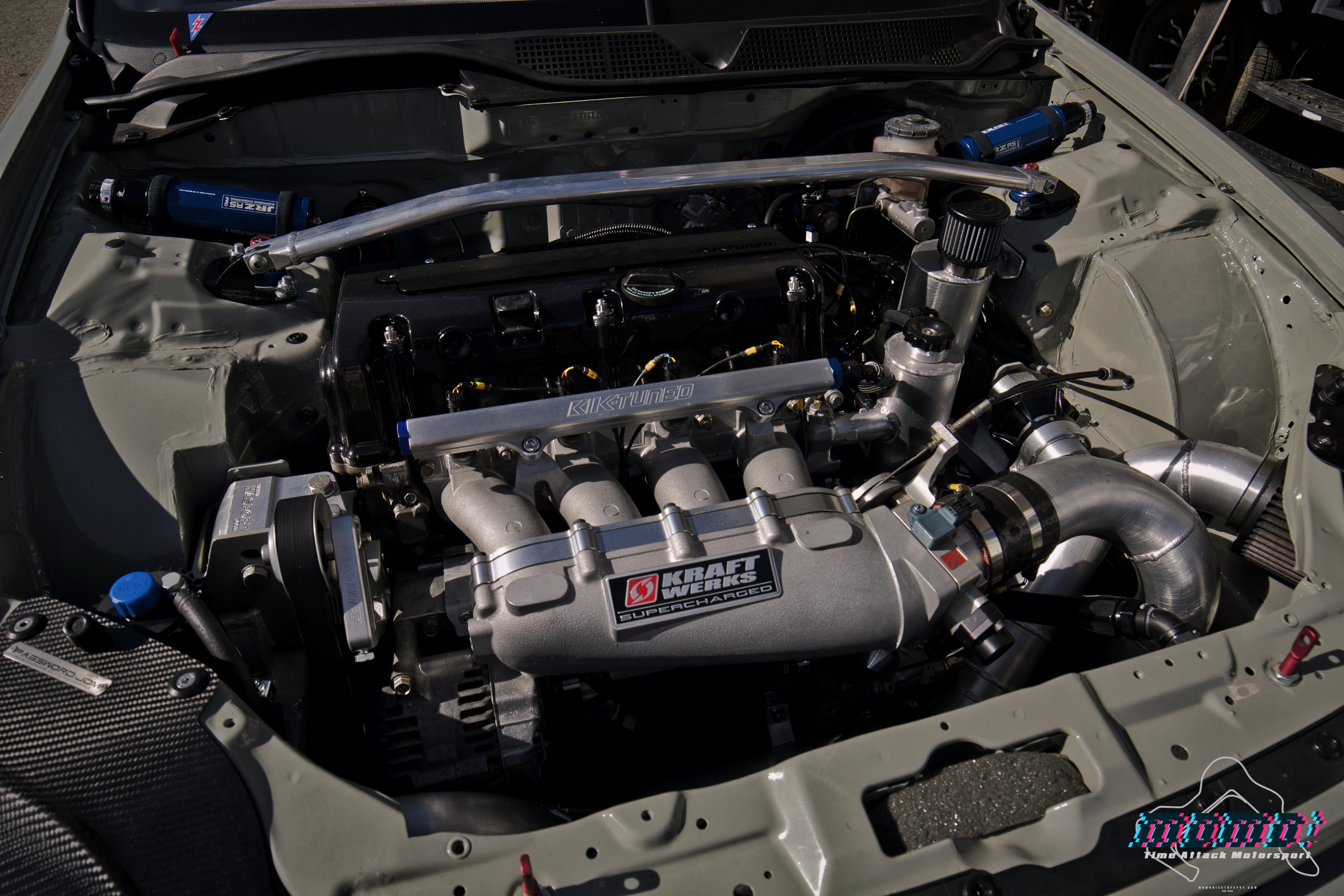 Under the hood… well, not really since these photos were taken with the hood off… but you get the point, sits a K20 power plant with a Kraftwerks supercharger that propelled the car to a first place finish in Unlimited FWD class in 1:51.435 seconds time. Not too shabby if you ask me…