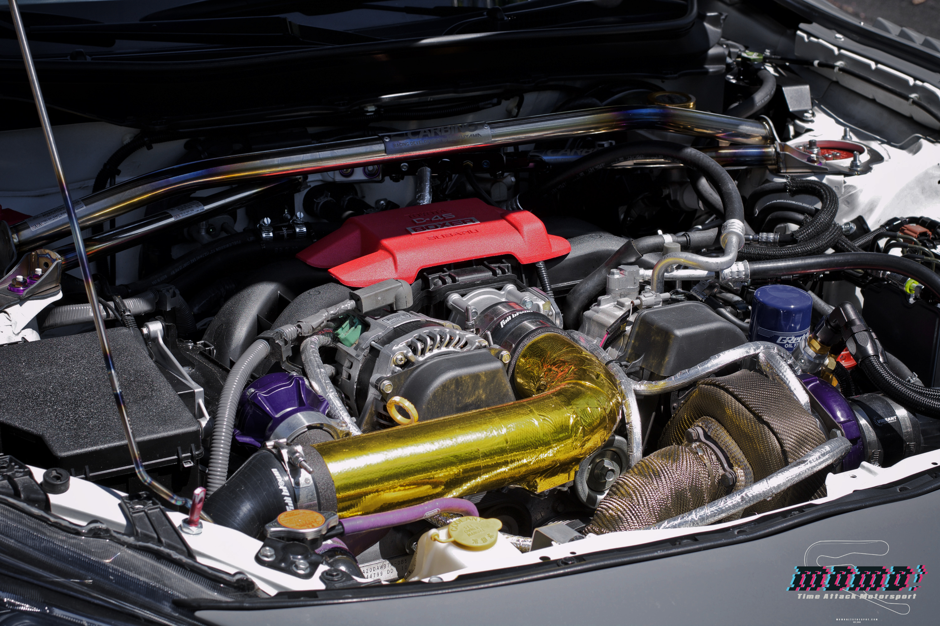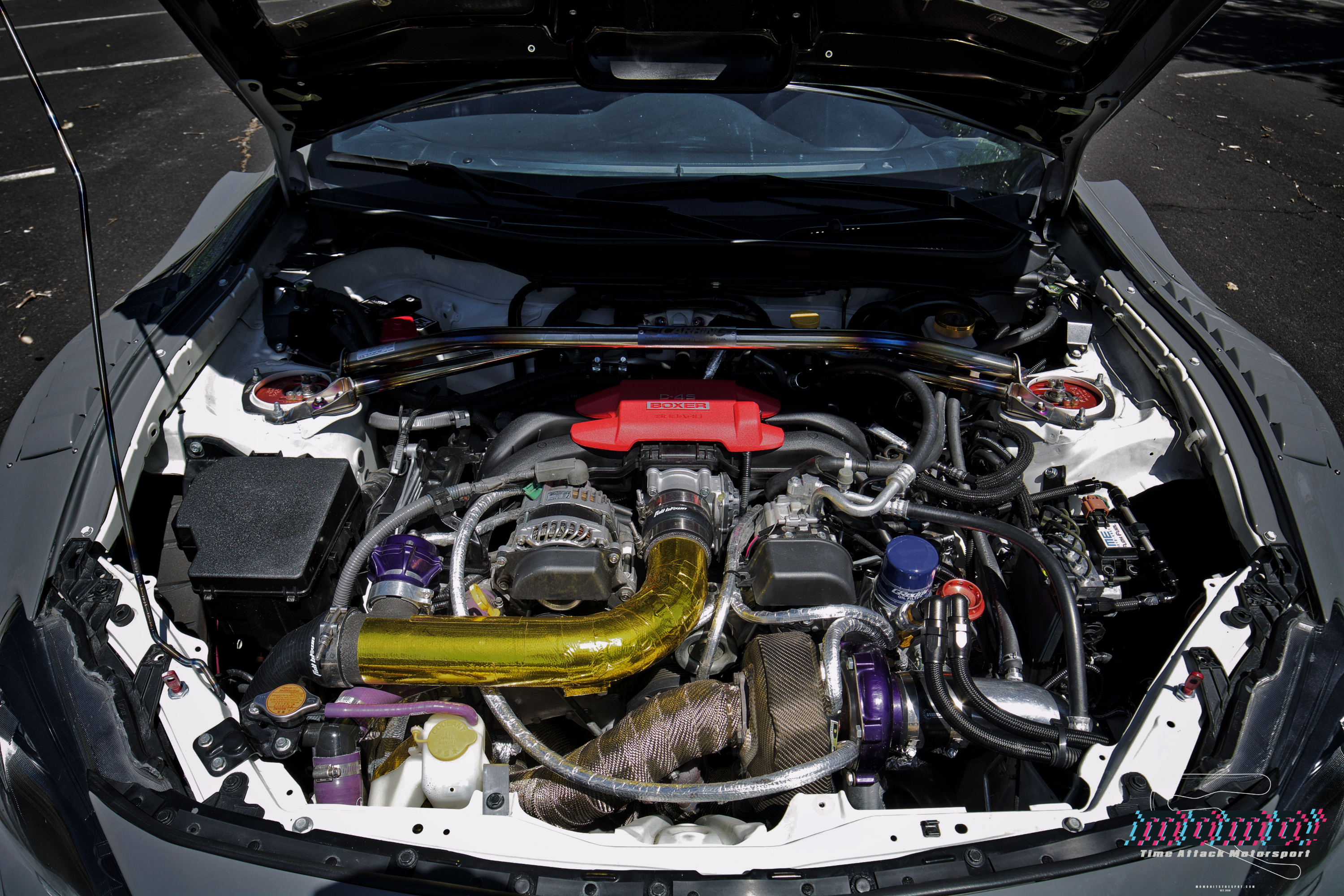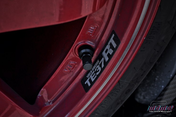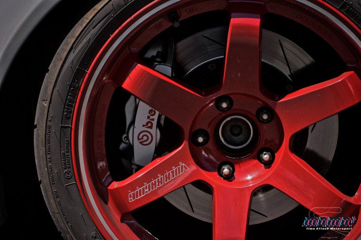 A combo of Volk Racing 18×10.5 +11 TE37RTs wrapped with Toyo R888 plus Brembo GT brakes makes for the perfect footwork for a nice track day!